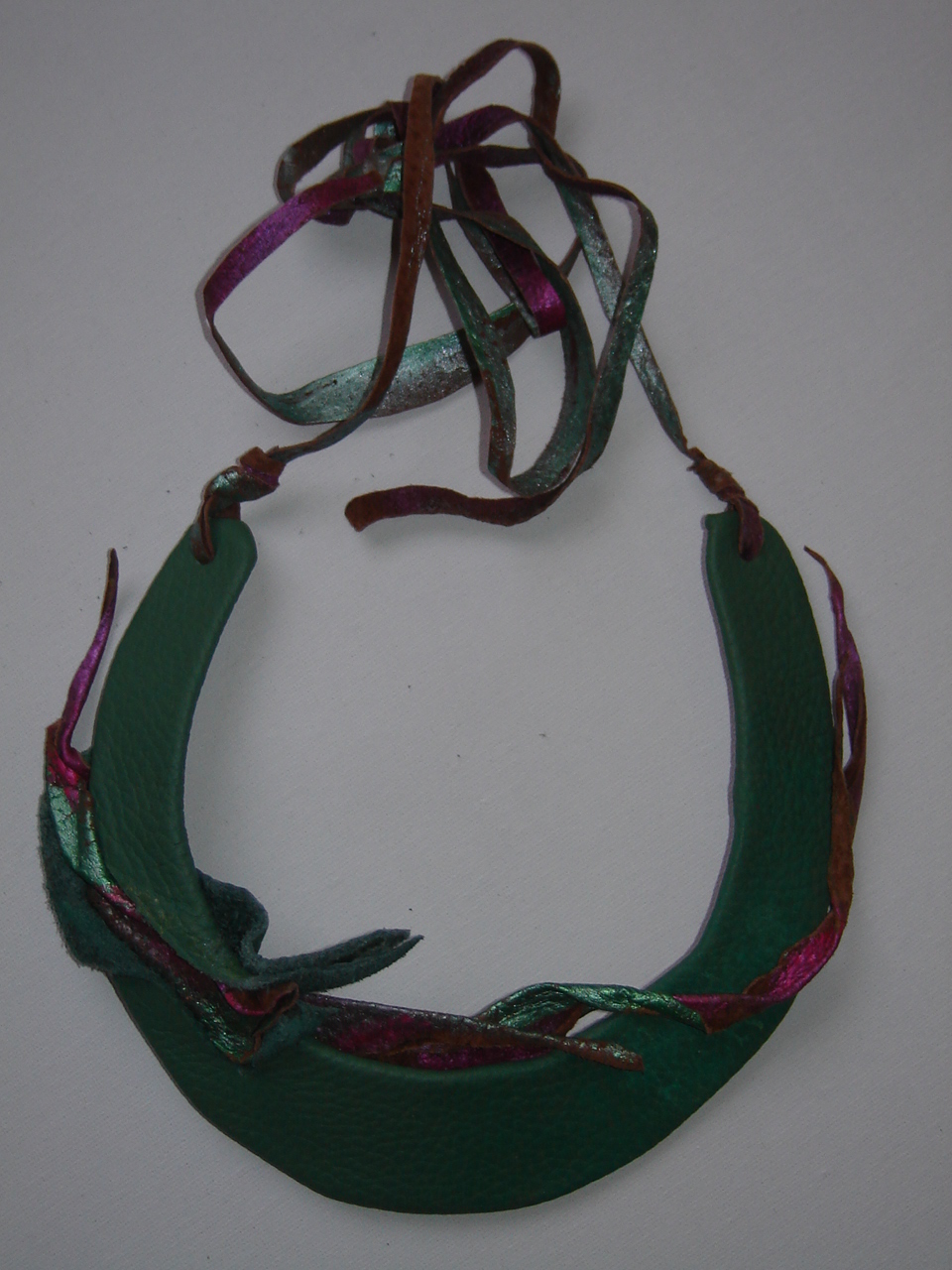 KOŽENÝ NÁHRDELNÍK zo zelenej kože.Kombinácia ružovej a fialovej kože.Najširšia časť 4 cm, veľkosť obruče-od dierok na šnúrky 14 cm.Šnúrky na zaväzovanie,zelené,fialové, ručne farbené s lístkami z kože siahajúcimi voľne na chrbát,dľžka každej 73 cm.