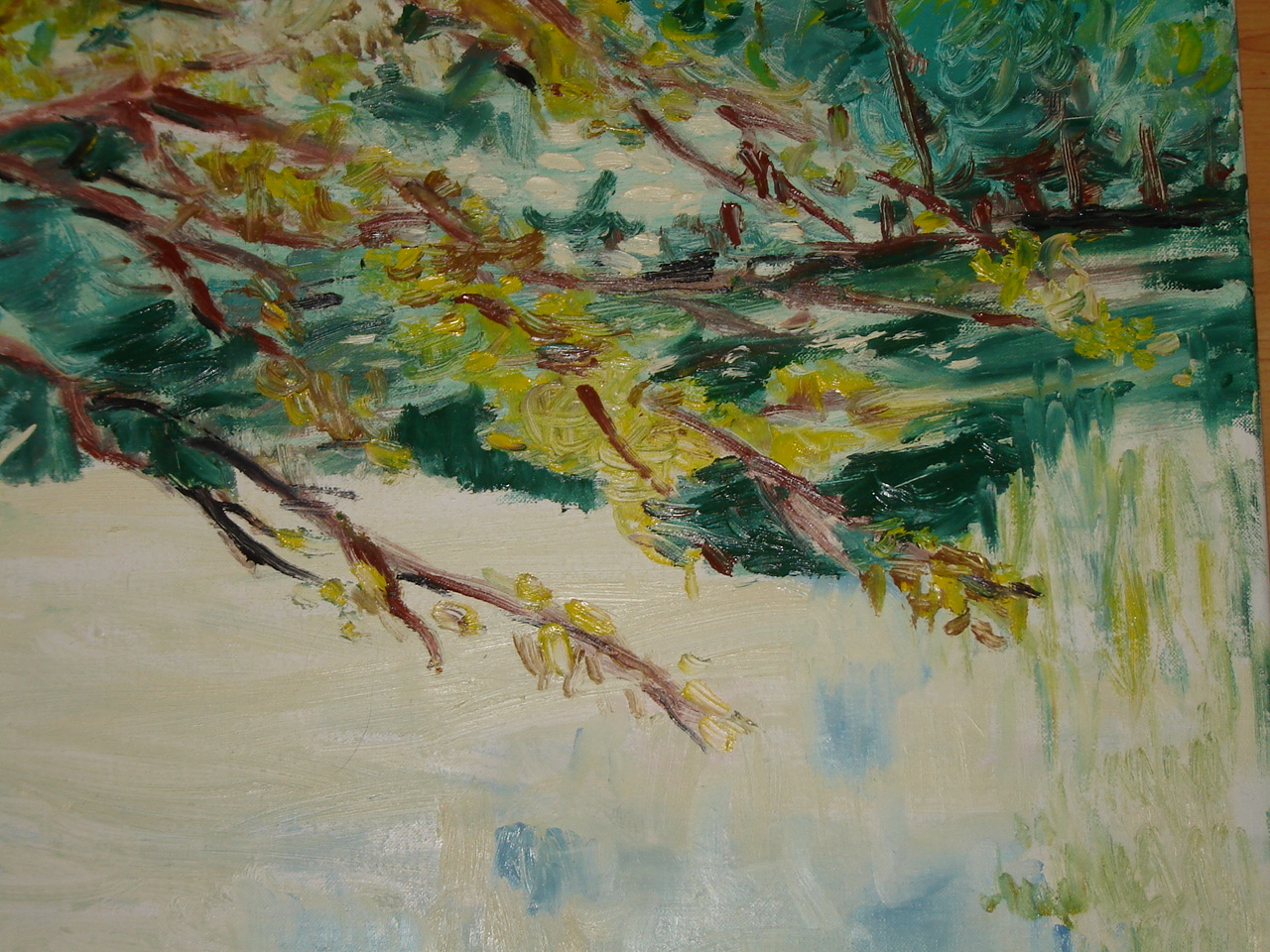 Obraz, olejové farby. Bez rámu, vhodné nzarámovať podľa výberu miesta na zavesenie. Alebo podľa nábytku.Rozmery : 100x80 cm. celý obraz pôsobí svetlo, sviežo, vhodný aj na tmavšie miesta priestoru.